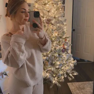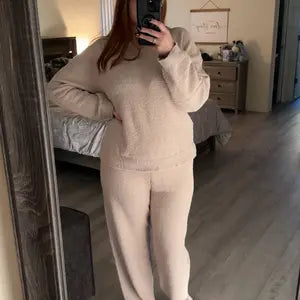 Stay warm and stylish with this fuzzy outfit, perfect for cool weather relaxation or casual outings.